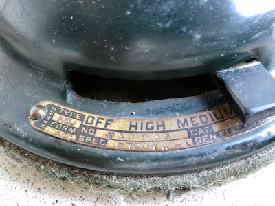 #375 SOLD GE 12" 1913 "round-back oscillator" in very good original condition. Runs and oscillates smoothly on all three speeds with good speed separation. This fan is as I got it from Bill Voigt's collection but I have given it a quick oil, added some grease to the gearbox and test run it for 40 minutes after which it was just slightly warm to the touch. A thorough cleaning and lubrication should be done on the fan before extensive running. There is a slight knocking when running that went away when I placed the fan on a piece of foam sheet on my tabletop. Motor, base, and yoke are made of cast iron (except for the die-cast rear motor plate and gearbox). There is nothing missing, broken, bent or cracked including the die-cast parts of the fan which are solid with no cracks or repairs. I have not had the fan apart but it does run well All parts have factory original finishes in good condition. The oscillator disk is made of brass on this earliest model round-back. The head wire is the original one in very good condition, the power cord is an older replacement but serviceable. The blade and guard are in very good condition and have never been polished still retaining the original "dipped and lacquered" finish that this fan had.